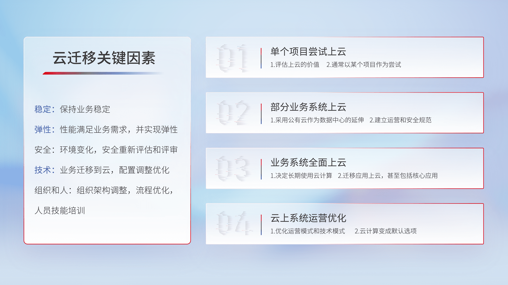 结合实际业务,,,从规划设计、、、、云平台选型、、云原生改造、、、、数据迁移、、集成交付,,,迁移全过程为客户识别最佳上云路径,,,,做好风险识别管理,,,设计网络架构、、、身份权限、、、、安全审计合规、、、、操作审计、、、、日志审计、、、监控告警策略、、、多站点容灾设计等,,,,对云上基础设施进行整体规划,,,提升IT治理水平,,以满足弹性、、、高可用、、高性能的需求。。。